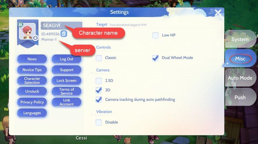 轻点 "Misc" 图标,您的角色名称和服务器将被显示。